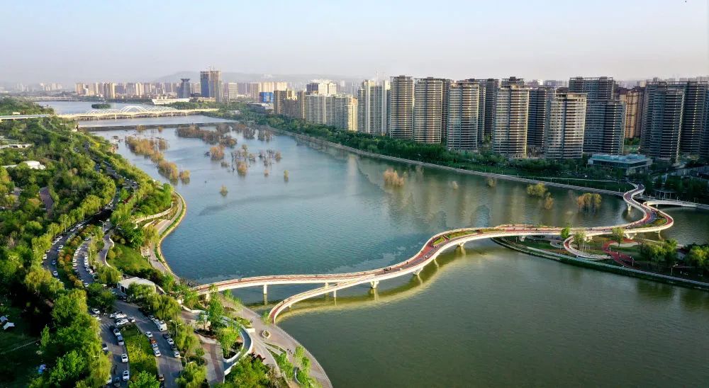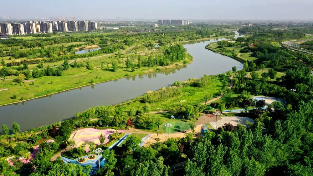 ↑西咸新區(qū)灃河兩岸景象(4月29日攝,無人機(jī)照片)。新華社記者 劉瀟 攝