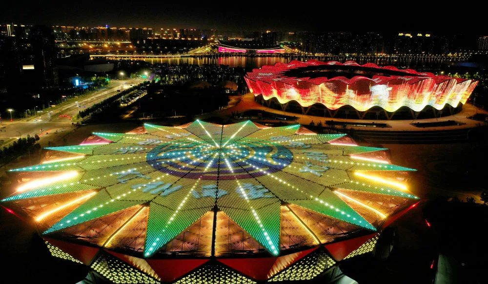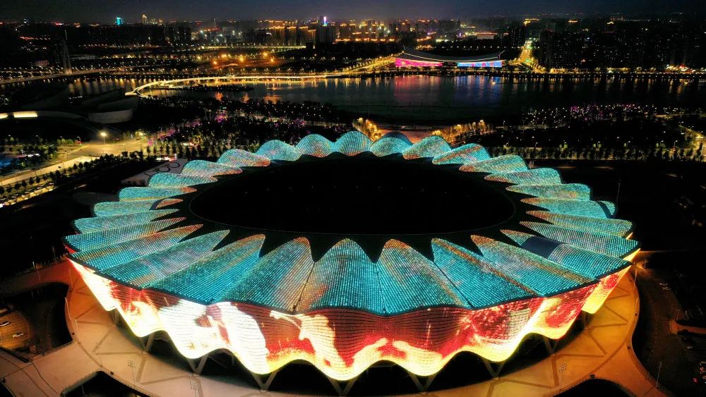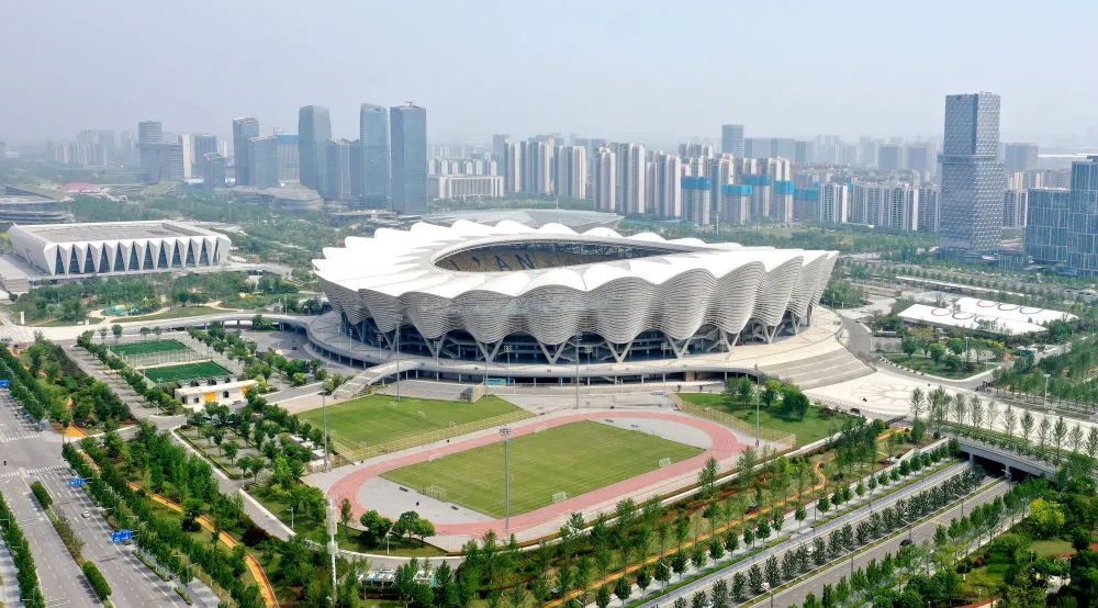 ↑位于西安國際港務(wù)區(qū)的西安奧體中心(5月1日攝,無人機(jī)照片)。新華社記者 劉瀟 攝