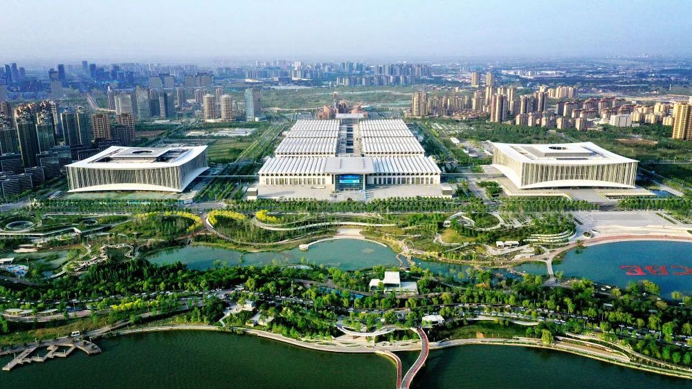 ↑位于西安浐灞生態(tài)區(qū)的西安國際會展中心(4月16日攝,無人機(jī)照片)。新華社記者 劉瀟 攝