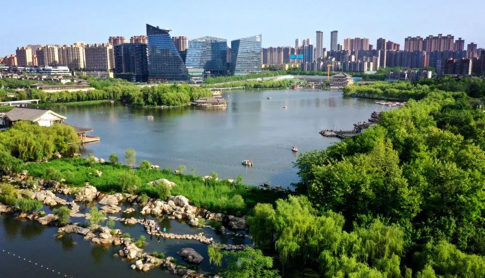 ↑西安曲江南湖(4月25日攝,無人機(jī)照片)。新華社記者 劉瀟 攝