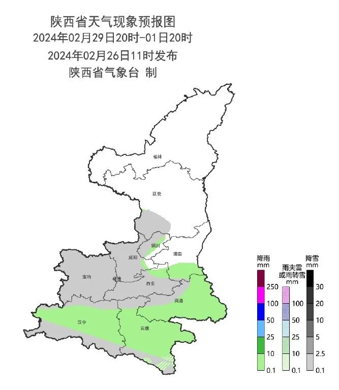 02月28日20時(shí)-02月29日20時(shí):全省陰天,陜北南部、關(guān)中大部、商洛及秦巴山區(qū)有小雪或雨夾雪(0.1-3.0mm);漢中、安康有小雨或雨夾雪(0.1-2.0mm),陜北北部有4級(jí)左右偏北風(fēng),日平均氣溫陜北北部下降4℃左右。