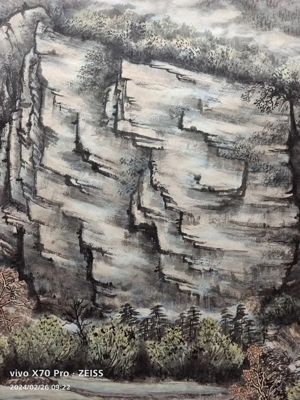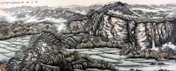 基于這樣的思考,一幅溪山作品的構(gòu)圖在腦海漸漸形成,它將是一幅以綠色為基調(diào)的青山綠水圖畫,是人與自然和諧共生的美麗情愫。全畫由近、中、遠(yuǎn)三部分構(gòu)成,以平視和仰視的角度分別體現(xiàn)。近景畫出幾塊巨大嶙峋的山石,配以年輪久遠(yuǎn)的古松和新植的翠松。背后是暮春的梯田、村落,小河邊有洗衣的婦女和在田間勞作的人們。這些符號(hào)結(jié)合在一起,所要表現(xiàn)的就是時(shí)空久遠(yuǎn)與現(xiàn)實(shí)的延伸,人與自然依然和諧共生共榮,增加現(xiàn)代生活氣息;中景突出巨碑式的丹霞層巖,巖上飛流而下的飛瀑,表現(xiàn)溪山的巍峨與壯觀,這是全畫中必須用心刻畫的細(xì)節(jié)。溪山的厚重、峻峭,都要通過有力的線條表現(xiàn)出來,增強(qiáng)溪山的氣勢和偉岸,但又要注意不能給人以壓抑感,要以云遮霧掩顯現(xiàn)它的神奇和神秘;遠(yuǎn)景是大山背后的遠(yuǎn)山層巒,分三層漸次疊加。最上一層是春暉映照的暖色遠(yuǎn)山,對整個(gè)的冷色基調(diào)形成對比和映襯,使畫面不至于過于沉郁。總之,我要表現(xiàn)的是春色之中磅礴而壯麗的溪山。