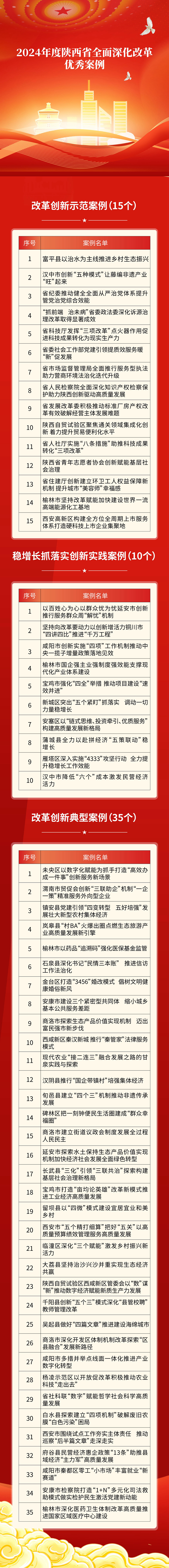 2024年度陜西省全面深化改革優(yōu)秀案例中,改革創(chuàng)新示范案例15個(gè),包括富平縣以治水為主線推進(jìn)鄉(xiāng)村生態(tài)振興等案例;穩(wěn)增長(zhǎng)抓落實(shí)創(chuàng)新實(shí)踐案例10個(gè),包括以百姓心為心以群眾憂為憂延安市創(chuàng)新推行服務(wù)群眾周“解憂”機(jī)制、堅(jiān)持向改革要?jiǎng)恿σ詣?chuàng)新增活力銅川市“四講四比”推進(jìn)“千萬(wàn)工程”、咸陽(yáng)市創(chuàng)新實(shí)施“四項(xiàng)”工作機(jī)制推動(dòng)中央一攬子增量政策落地見(jiàn)效等案例;改革創(chuàng)新典型案例35個(gè),包括未央?yún)^(qū)以數(shù)字化賦能為抓手打造“高效辦成一件事”創(chuàng)新服務(wù)新場(chǎng)景、渭南市貿(mào)促會(huì)創(chuàng)新“三聯(lián)助企”機(jī)制“一企一策”精準(zhǔn)服務(wù)外向型企業(yè)、鎮(zhèn)安縣黨建引領(lǐng)“四變轉(zhuǎn)型 五好培強(qiáng)”發(fā)展壯大新型農(nóng)村集體經(jīng)濟(jì)等案例。