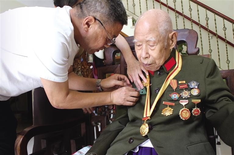 8月22日,99歲的我省抗戰(zhàn)老戰(zhàn)士劉炳榮佩戴國(guó)家頒發(fā)的“中國(guó)人民抗日戰(zhàn)爭(zhēng)勝利80周年”紀(jì)念章。 本報(bào)通訊員 吳寬宏攝