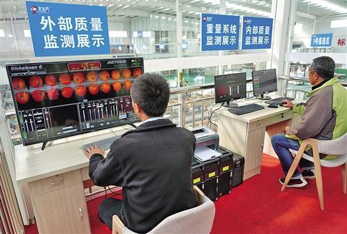 陜西洛川一蘋果企業(yè)車間內(nèi),工作人員通過智能選果控制系統(tǒng)監(jiān)測分選線上蘋果的外觀以及糖度、糖酸比。 新華社記者 邵 瑞攝 “霜降一過,上樹摘果”。初冬到來,……