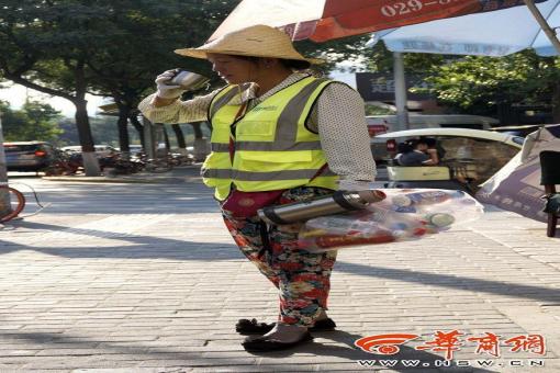 7月22日下午5時許,西安市南二環(huán)中段,一名保潔員戴著草帽在喝水,她手中還拎著撿到的飲料空瓶。 記者 趙彬 攝 因為在檢查中發(fā)現(xiàn)保潔路面煙頭較多,一名保潔員……