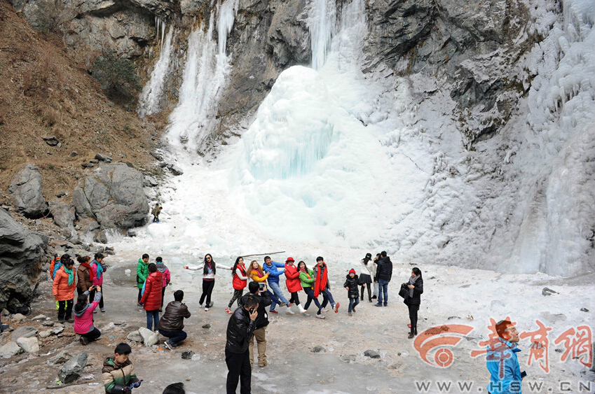 昨日下午2時(shí),游客在戶縣澇峪黑山瀑布前合影留念。不時(shí)有冰塊從瀑布上方掉落,著實(shí)讓人捏了一把汗 記者 趙彬 攝進(jìn)入冬季后,秦嶺72峪開(kāi)始出現(xiàn)冰凍瀑布的奇觀,不……