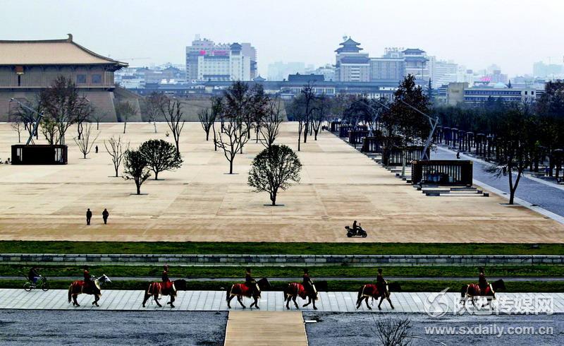 一列馬隊(duì)從西安的大明宮遺址公園的含元殿遺址前經(jīng)過(guò)(2011年12月7日攝)。6月22日,中國(guó)與吉爾吉斯斯坦、哈薩克斯坦聯(lián)合提交的“絲綢之路:長(zhǎng)安—天山廊道路……