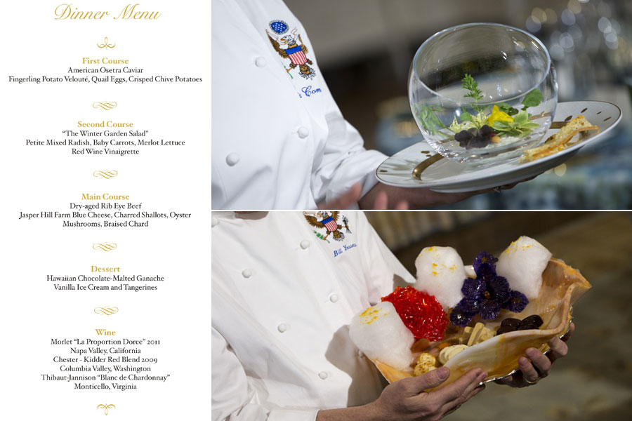 此次宴會在白宮花園舉行,共有4道菜肴。第一道菜是來自美國伊利諾伊州河口的奧西特拉魚子醬,配上來自賓夕法尼亞州的鵪鶉蛋,以及來自紐約州、愛達荷州以及加州農(nóng)場的數(shù)十種馬鈴薯。