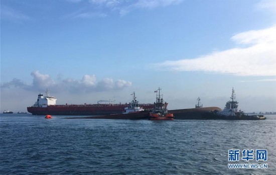 9月13日,四艘拖船將部分淹沒的挖沙船轉(zhuǎn)移至新加坡安樂島附近海域,以便進(jìn)行水下搜索活動(dòng)。新華社發(fā)(新加坡海事及港務(wù)管理局供圖)