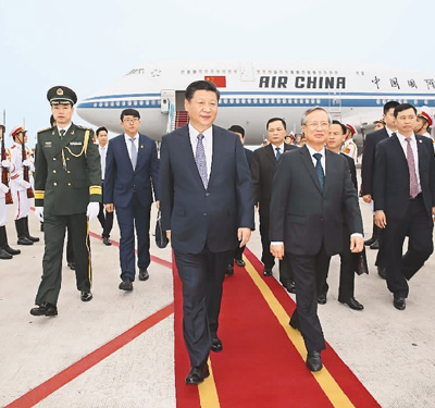 當?shù)貢r間上午11時10分許,習近平乘坐的專機抵達河內內排國際機場。習近平步出艙門,越共中央政治局委員、中央書記處常務書記、中央檢查委員會主任陳國旺等在舷梯旁迎接。越南青年向習近平獻上鮮花。禮兵分列紅地毯兩側。身著盛裝的越南群眾揮舞著中越兩國國旗歡迎習近平。