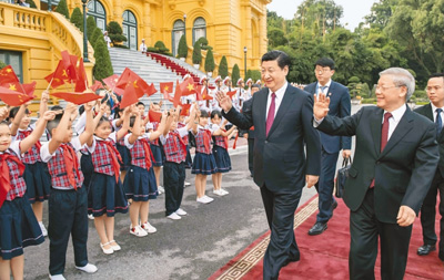 會談前,阮富仲在主席府廣場舉行盛大歡迎儀式。廣場外簇擁著身著民族服裝迎候習近平的當?shù)孛癖。習近平乘車抵達時,越南少年兒童揮舞著中越兩國國旗熱烈歡迎習近平到來。阮富仲在停車處迎接,越南兒童向習近平獻上鮮花。習近平同阮富仲登上檢閱臺。軍樂隊奏中越兩國國歌,鳴21響禮炮。習近平在阮富仲陪同下檢閱儀仗隊。全體儀仗隊員用越南語高呼“?倳浬眢w健康”。習近平同越方陪同人員握手,阮富仲同中方陪同人員握手。習近平和阮富仲返回檢閱臺,觀看分列式。兩國領導人前往越共中央駐地時,越南青年拋撒花瓣歡迎。