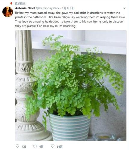 英國(guó)女消防員尼科爾近日在推特上發(fā)文寫(xiě)道:“家母離世前曾留下嚴(yán)格指示,要我爸爸為浴室內(nèi)的植物澆水。他定期澆水灌溉,它們很漂亮,他搬家時(shí)決定一起帶走,卻發(fā)現(xiàn)它們是塑料的!我彷佛聽(tīng)到媽媽正在咯咯地笑。”
