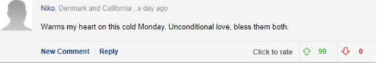 網(wǎng)友Niko:“在這個冰冷的周一,他們之間無條件的愛讓我感覺到了溫暖。祝福他們。”