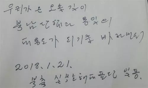 21日,朝鮮三池淵管弦樂團(tuán)團(tuán)長玄松月一行前往韓國,為朝鮮藝術(shù)團(tuán)冬奧會(huì)期間赴韓演出提前“踩點(diǎn)”。當(dāng)晚朝方人員用過晚餐后,玄松月在酒店留言簿寫了一句話:“希望我們走過的羊腸小道,可以成為北南團(tuán)結(jié)和統(tǒng)一的大路”。署名為“朝方實(shí)務(wù)了解代表團(tuán)全體”。雖然內(nèi)容簡(jiǎn)短,卻引發(fā)了韓國輿論的猜測(cè)。