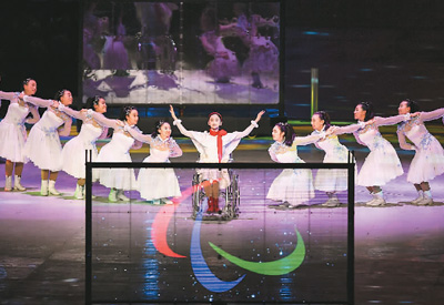 3月18日,2018年平昌冬殘奧會(huì)閉幕式在韓國(guó)平昌奧林匹克體育場(chǎng)舉行。閉幕式北京文藝表演上,現(xiàn)場(chǎng)大屏幕播放了北京2022年冬殘奧會(huì)會(huì)徽“飛躍”短片,集中展現(xiàn)了殘疾人運(yùn)動(dòng)員以堅(jiān)強(qiáng)的意志作為精神的翅膀,在冬殘奧賽場(chǎng)上放飛青春夢(mèng)想。伴隨著主題歌《我要飛》,中國(guó)殘疾人藝術(shù)團(tuán)的聽障演員們奉獻(xiàn)了一場(chǎng)精彩表演。
