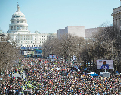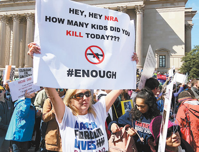 3月24日,來自全美各地的近50萬人涌入美國首都華盛頓,參加以“為了我們的生命”為主題的反對槍支暴力大游行。游行者呼吁美國政府采取更加嚴(yán)格的控槍措施,保護(hù)校園安全,同時要求政客們不再接受美國全國步槍協(xié)會等團(tuán)體的政治獻(xiàn)金。這一天,從紐約、波士頓、洛杉磯,再到上月發(fā)生校園槍擊案的佛羅里達(dá)州帕克蘭,同一主題的大游行在全美390多個城市同步舉行。美國民眾尤其是青少年學(xué)生紛紛走上街頭,響亮地發(fā)出他們的聲音:“面對槍支暴力,我們不再沉默,政客們必須在控槍問題上有所作為!