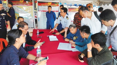 | 3月21日,一艘中國(guó)挖沙船在馬來(lái)西亞附近海域傾覆。圖為中國(guó)駐馬來(lái)西亞大使館人員在搜救現(xiàn)場(chǎng)與馬方官員交流。(照片由外交部領(lǐng)保中心提供) |