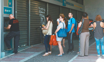 | 希臘債務(wù)危機(jī)于2015年大選后急劇惡化,引發(fā)國(guó)內(nèi)擠兌“狂潮”。圖為2015年7月2日,雅典民眾在取款機(jī)前排隊(duì)取錢(qián)。 |