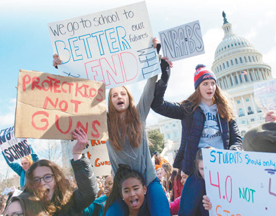 | 主張槍支自由的利益團(tuán)體在美國(guó)選舉政治中舉足輕重,特朗普政府依舊囿于利益對(duì)控槍?xiě)B(tài)度曖昧引發(fā)民眾不滿。圖為2018年3月14日,美國(guó)學(xué)生在華盛頓游行呼吁加強(qiáng)對(duì)槍支管控。 |