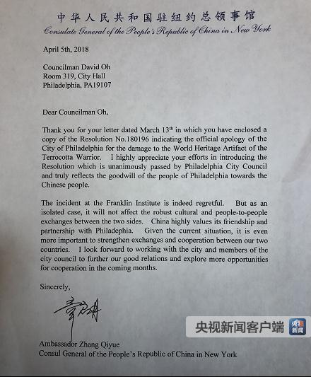 目前,這份書(shū)面道歉決議已經(jīng)正式呈交中國(guó)駐紐約總領(lǐng)事章啟月,得到了中方的書(shū)面回復(fù),并于當(dāng)?shù)貢r(shí)間4月5日轉(zhuǎn)呈陜西省文物交流中心。(央視記者 王萌 王風(fēng)華)