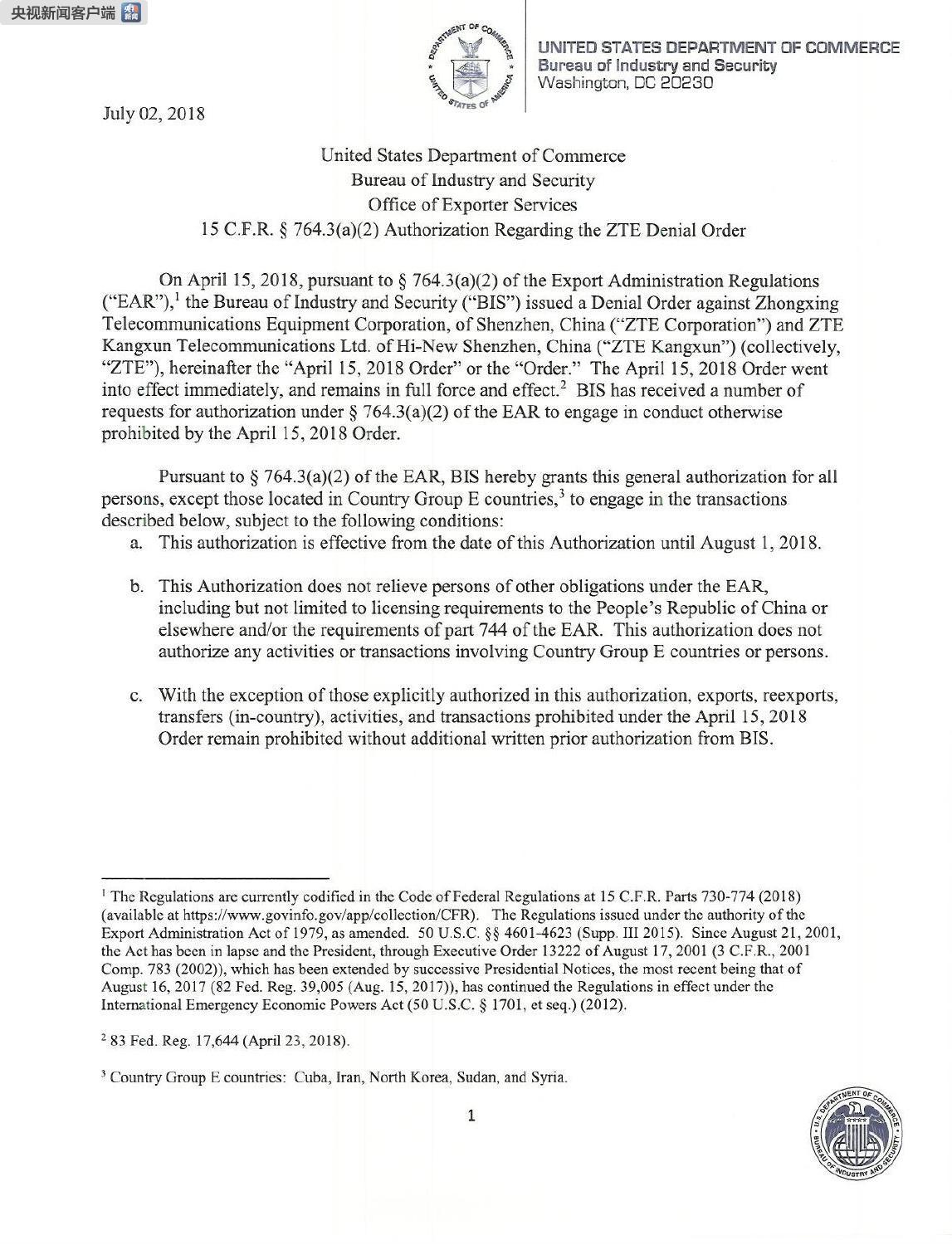 美國(guó)東部時(shí)間7月2日,美國(guó)商務(wù)部發(fā)布公告,暫時(shí)、部分解除對(duì)中興通訊公司的出口禁售令。sRj安康新聞網(wǎng)