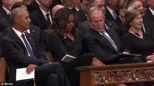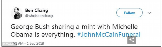 原標(biāo)題:小布什在麥凱恩追悼會上給米歇爾傳糖 美國網(wǎng)友被暖到了