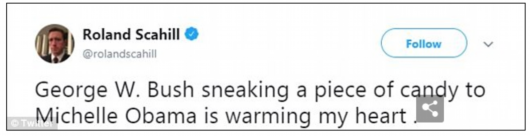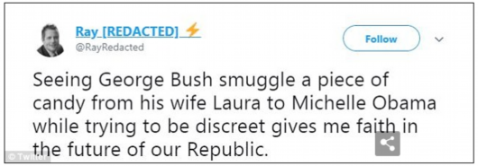 “看到小布什從妻子手中接過糖果給米歇爾,同時又試圖保持謹(jǐn)慎,讓我對共和黨的未來充滿希望。”