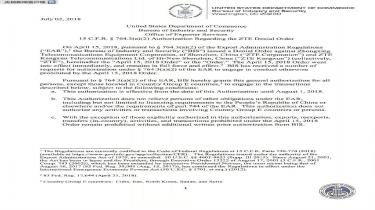美國東部時間7月2日,美國商務部發(fā)布公告,暫時、部分解除對中興通訊公司的出口禁售令。 公告稱:從公告發(fā)布之日起至8月1日,在有限條件下解除……