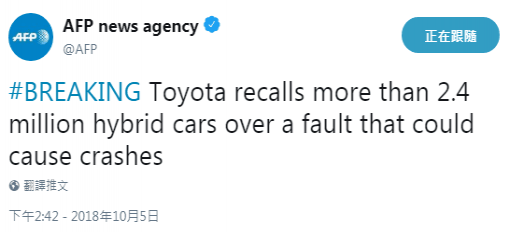 【環(huán)球網(wǎng)報(bào)道 記者 崔舒飛 張飛揚(yáng)】據(jù)法新社5日最新消息,因發(fā)現(xiàn)存在可導(dǎo)致車禍的錯誤,豐田汽車公司召回超過240萬輛混合動力車。 據(jù)路透社報(bào)道,此次召回包括……