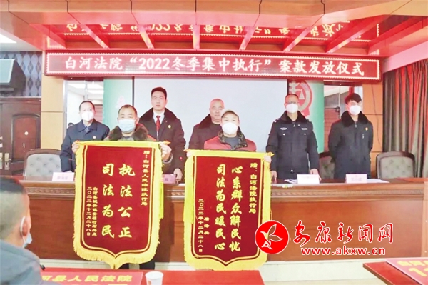 發(fā)放儀式上,通報(bào)了白河法院2022年冬季集中執(zhí)行行動(dòng)開(kāi)展情況,對(duì)國(guó)家司法救助條件和程序進(jìn)行了詳細(xì)解讀, 32名申請(qǐng)執(zhí)行人領(lǐng)取了案款發(fā)款牌,發(fā)放儀式井然有序進(jìn)行。據(jù)悉,自2022年11月1日“冬季集中執(zhí)行行動(dòng)”開(kāi)展以來(lái),白河法院共執(zhí)結(jié)執(zhí)行案件474件,執(zhí)行到位金額9672.8萬(wàn)元,共宣布拘留12人,將69人納入失信被執(zhí)行人名單,向78人發(fā)出限制消費(fèi)令。該院集中執(zhí)結(jié)涉民生案件142件,執(zhí)行到位金額153.2萬(wàn)元,同時(shí)積極爭(zhēng)取資金,為困難申請(qǐng)人落實(shí)司法救助資金48.01萬(wàn)元。