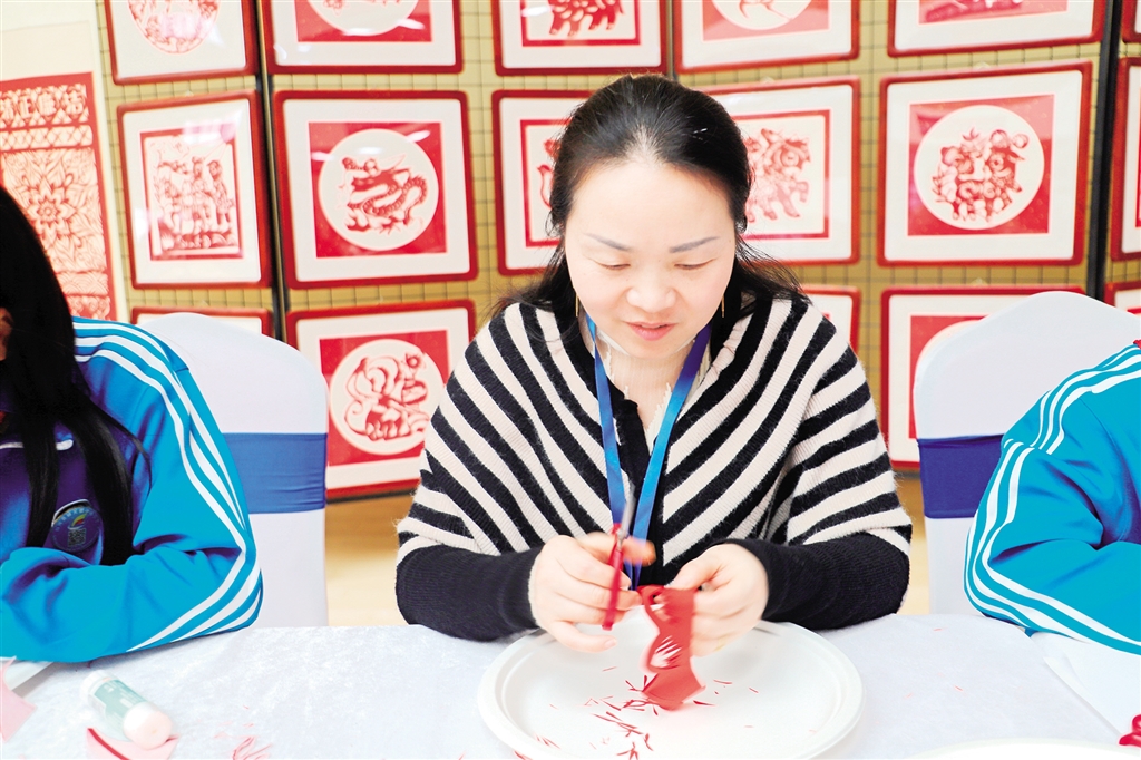 走進(jìn)張莉的課堂里,滿目色彩繽紛的剪紙作品,大大小小地陳列在展臺(tái)處。整整齊齊的桌凳圍成一個(gè)個(gè)不同形狀,以便于學(xué)生更好地進(jìn)行交流。她用學(xué)生通俗易懂的語(yǔ)言為學(xué)生傳授剪紙技巧:“同學(xué)們,我們首先把需要用的彩紙對(duì)折接著裁剪出合適的大小。然后再描出自己想要剪出的形狀……”通過(guò)紙張?jiān)谥讣鈦?lái)回翻轉(zhuǎn),手中的剪刀“咔嚓咔嚓”,一幅幅美輪美奐的作品便呈現(xiàn)在眼前。每周張莉都要給學(xué)生們上幾節(jié)美術(shù)課,這也讓很多學(xué)生對(duì)剪紙產(chǎn)生了濃厚的興趣,創(chuàng)造出很多優(yōu)秀作品。