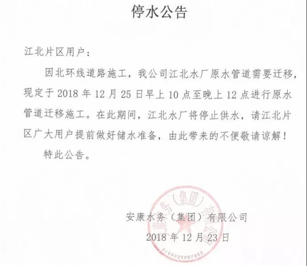 因北環(huán)線道路施工,安康水務(wù)(集團)有限公司江北水廠原水管道需要遷移,現(xiàn)定于2018年12月25日上午10時至晚上12時進行原水管道遷移施工。在此期間,江北水廠將停止供水,請江北片區(qū)廣大用戶提前做好儲水準(zhǔn)備,由此帶來的不便敬請諒解!