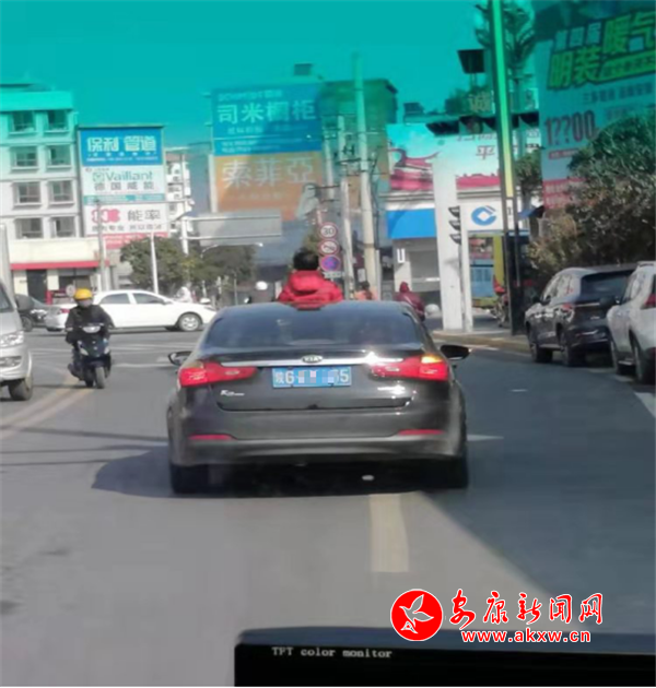 本網(wǎng)訊(通訊員 唐波)2月11日,有網(wǎng)友舉報(bào),一輛小轎車在行駛過程中,駕駛?cè)朔湃诬囍泻⒆影杨^探出天窗觀賞風(fēng)景,非常危險(xiǎn)。