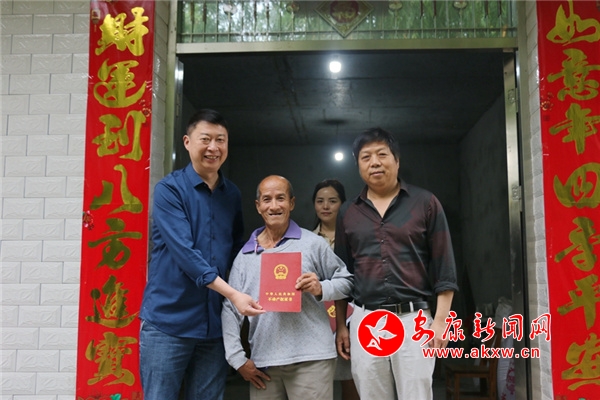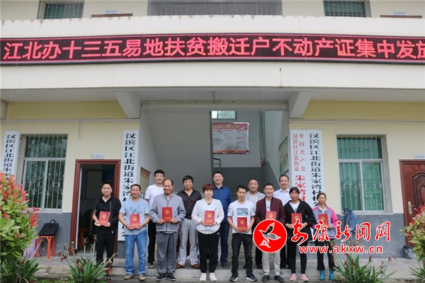 當(dāng)天,江北街道辦事處工作人員為12戶十三五易地扶貧搬遷貧困戶送去一份大禮——新家的不動(dòng)產(chǎn)權(quán)證書,自此這12棟房屋有了“身份證”。