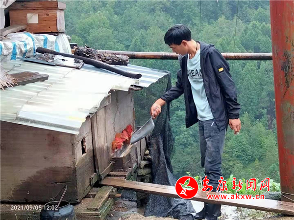 第二天一早,剛剛從防汛重點(diǎn)警示區(qū)完成排查的朱文杰一邊喊著“柯亮,騎上摩托,我們?nèi)ソo唐第禮把豬和雞喂了”,一邊換下早已被雨水打濕的外套,披上一件志愿服背心,勉強(qiáng)抵御陣陣襲來的涼意,撐上那把“外面下暴雨,里面下小雨”的大紅傘,匆匆趕去兌現(xiàn)當(dāng)“飼養(yǎng)員”的承諾。