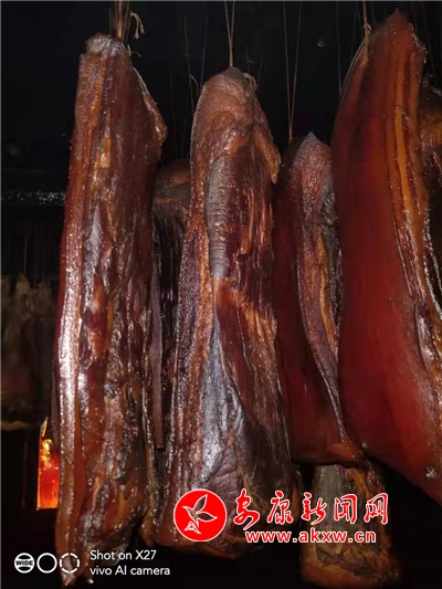 烘房里掛滿了密密麻麻的臘肉。一塊塊臘肉金黃油亮,散發(fā)著沁脾的臘香,幾段青岡木橫在地上,灰白的余燼中閃著火星。