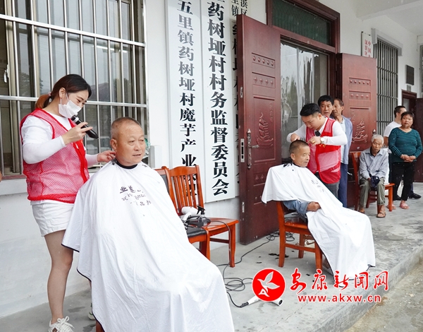 7月19日一大早,五里鎮(zhèn)藥樹埡村熱鬧非凡。很多村民陸續(xù)趕到村委會,排隊(duì)理發(fā)。“我平常理發(fā)要去鎮(zhèn)上,來回一趟得兩三個(gè)小時(shí),還要花二三十的車費(fèi)。這次有人來免費(fèi)給我們理發(fā),真開心。”剛理完發(fā)的曹德秀阿姨高興地說。