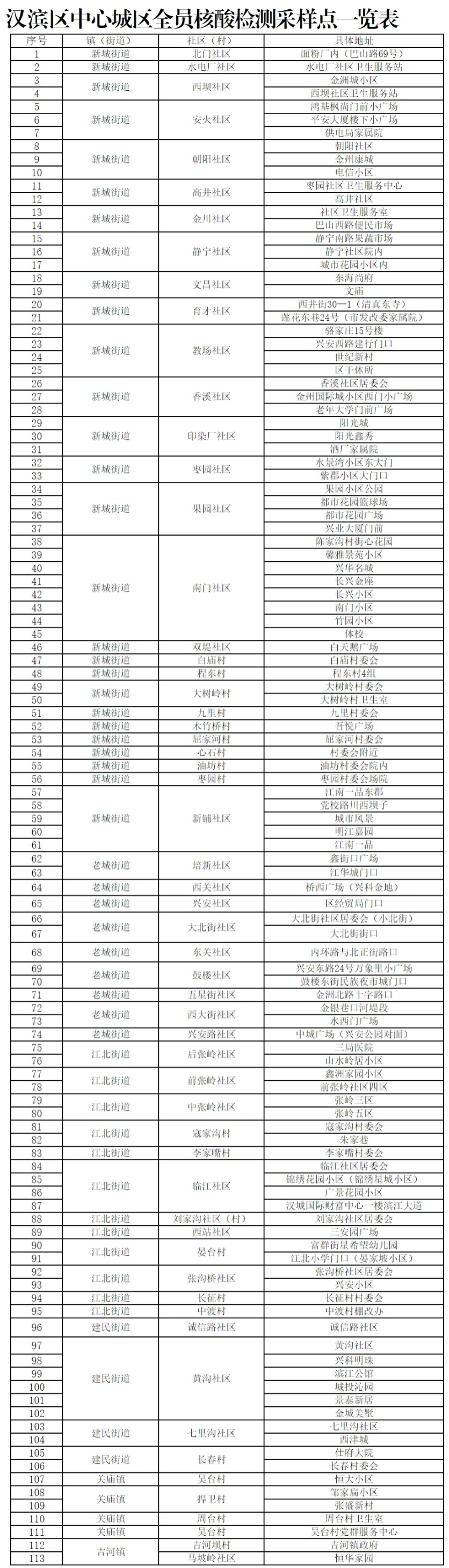 共設(shè)置113個采樣點(見附件),由各街道、鎮(zhèn)政府統(tǒng)一安排采樣點設(shè)置、人員組織、秩序維護(hù)。檢測對象按照街道和鎮(zhèn)政府要求,分時段有序到指定地點進(jìn)行采樣,避免人員聚集。