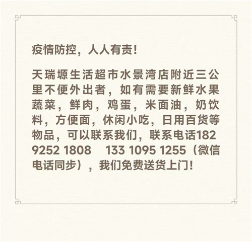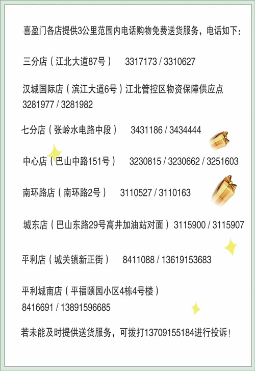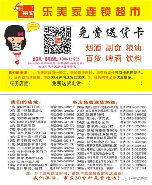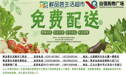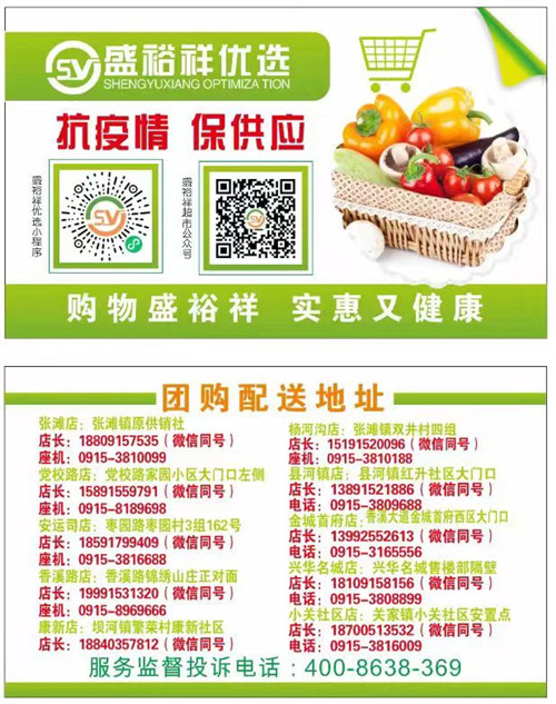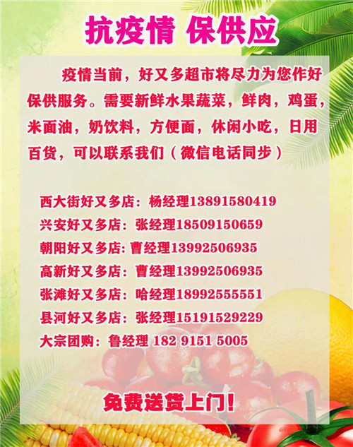 為滿足廣大市民群眾生活必需品的購買需求,避免因人群聚集造成的交叉感染風險,漢濱區(qū)經(jīng)貿(mào)局組織漢濱中心城區(qū)多家保供企業(yè)(超市)推出免費送貨服務,市民朋友可撥打就近購物店電話,各商家將盡心盡力為大家做好服務,解決您的購買需求。PvN安康新聞網(wǎng)