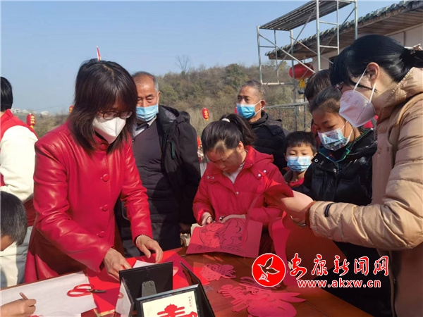 除了精彩的文藝表演,來(lái)自漢濱區(qū)文化館的駐村幫扶工作人員還組織了該館業(yè)務(wù)干部和非遺傳承人開(kāi)展寫(xiě)春聯(lián)、剪窗花、玩社火、印版畫(huà)、包餃子等民俗活動(dòng),讓村民們流連忘返。書(shū)法家們揮毫潑墨,以書(shū)寫(xiě)春聯(lián)和“福”字的方式為村民們送上新春祝福;窗花、版畫(huà)的互動(dòng)活動(dòng)也吸引了不少村民們的駐足圍觀,來(lái)自漢濱區(qū)文化館的文化志愿者們現(xiàn)場(chǎng)示范講解,一幅幅精美的作品在他們手中呈現(xiàn),有的還沒(méi)完工,就已被圍觀的村民們搶先預(yù)定……