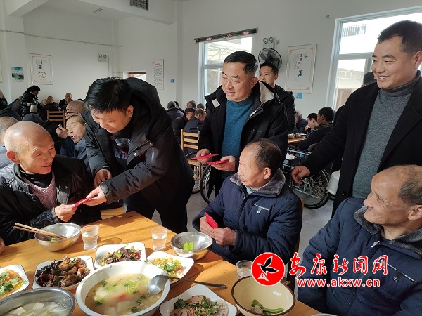 中午11點(diǎn),“客人”準(zhǔn)時(shí)而至。“大家新年好!給大家拜年了!一會(huì)兒咱們一起吃團(tuán)年飯!”早陽鎮(zhèn)黨委書記金鑫和副鎮(zhèn)長陳志恒剛走進(jìn)敬老院,就熱情地?fù)]著手和老人們打著招呼。走進(jìn)敬老院的餐廳,一股濃濃的香味撲面而來,十張桌子上早已整齊地?cái)[放著豐盛的菜肴,紅苕蒸肉、紅燜肘子、紅燒雞塊、八寶飯、涼拌菠菜……紅的綠的擺滿整張桌子,讓人賞心悅目。VA9安康新聞網(wǎng)