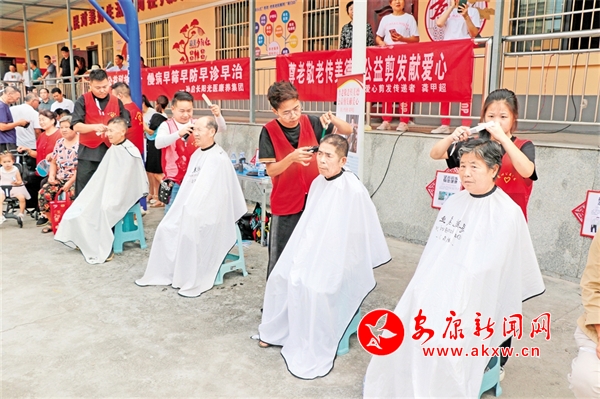 現(xiàn)場(chǎng),通過有獎(jiǎng)問答、發(fā)放宣傳資料、設(shè)立咨詢臺(tái)等形式,向村民進(jìn)行平安建設(shè)、普法、反詐等宣傳。來自漢濱區(qū)陽(yáng)光愛心護(hù)理院的志愿者們?yōu)槔先藗兲峁┙】抵笇?dǎo)。愛心人士龔甲超組織的義剪活動(dòng)也受到了老人們的歡迎,志愿者們免費(fèi)為現(xiàn)場(chǎng)50多名老人理發(fā)。書法家們現(xiàn)場(chǎng)圍繞“孝義”主題進(jìn)行創(chuàng)作,并贈(zèng)送給群眾。演出結(jié)束后,近百名老人到社區(qū)的孝義食堂參觀和免費(fèi)用餐。