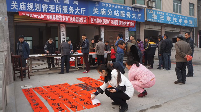 為認(rèn)真貫徹文化部“文化進萬家”活動要求,日前,漢濱區(qū)2015年“萬副春聯(lián)進農(nóng)家活動”在關(guān)廟鎮(zhèn)金星村舉行。啟動儀式由區(qū)文廣局、關(guān)廟鎮(zhèn)、區(qū)文化館、區(qū)……