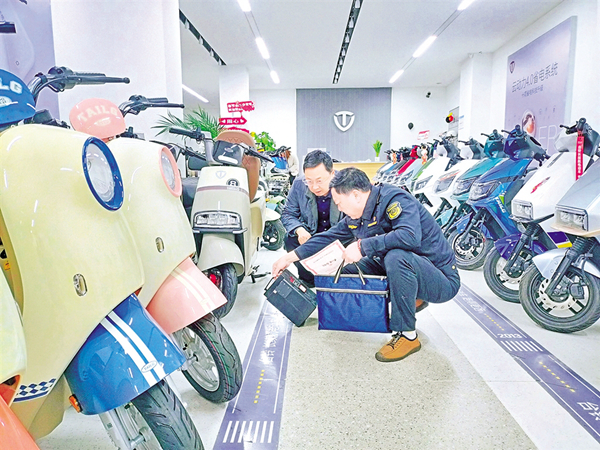 ①執(zhí)法人員檢查電動自行車配件。席瑾 攝②向電動自行車銷售人員了解情況。席瑾 攝本網(wǎng)訊(通訊員 柯賢會 喬巍)“請出示電動自行車合格證件!薄按蜷_蓋板,看看……