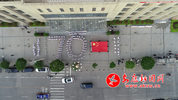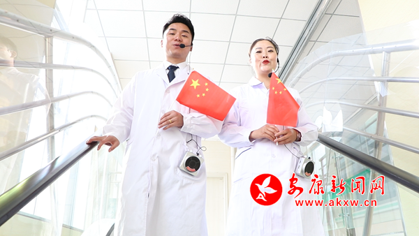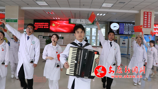 當(dāng)日8點(diǎn)20,一名醫(yī)生從科室中取出手風(fēng)琴,來到大廳中開始演奏。隨著樂曲響起,一位位手持小紅旗、胸嵌黨徽的醫(yī)護(hù)人員從人群中走出,他們或面對周圍觀眾,或互相對望,深情動人的歌聲讓現(xiàn)場觀眾備受感染,吸引越來越多的患者和路人駐足觀望。隨后,他們走出大廳,來到醫(yī)院門口,在這里,數(shù)百名醫(yī)護(hù)人員在歌聲中匯聚,一側(cè)高舉國旗,一側(cè)形成方陣,大家揮動著手中的小紅旗,一齊高聲歌唱著《我和我的祖國》。在清晨陽光的照射下,鮮艷的五星紅旗和“70”方隊(duì)格外醒目,大家齊聲高唱,歌聲經(jīng)久不息,令人熱血澎湃、催人奮進(jìn)。
