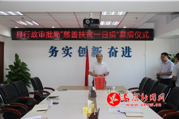 8月29日下午,在縣行政審批局的宣傳發(fā)動(dòng)下,局領(lǐng)導(dǎo)班子帶頭,全體黨員干部踴躍參與,一些因公出差或公休不能到場(chǎng)的同志也積極響應(yīng),慷慨解囊,委托同事代為捐款,表達(dá)自己的愛心和對(duì)慈善扶貧事業(yè)的支持。
