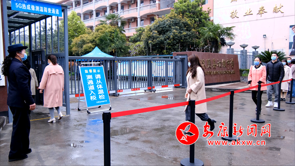 校門口是學(xué)生入校的第一關(guān)。演練現(xiàn)場(chǎng),設(shè)置有5G熱成像檢測(cè)通道,安保人員組織“學(xué)生”有序排隊(duì),“學(xué)生”們按要求保持間隔1米以上,接受身份核驗(yàn)后依次從檢測(cè)通道的消毒墊上踏過(guò)。通道卡口測(cè)溫組的老師檢測(cè)“學(xué)生”體溫,體溫正常“學(xué)生”,順利進(jìn)入校園。