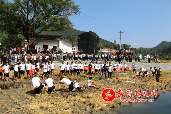 活動中,農(nóng)民運動會將氛圍推向了高潮。“加油……加油……”在稻田里上演著一場精彩的割稻谷比賽。來自雙河口鎮(zhèn)11個村的55名割稻能手分成11組,一組5人,參賽者們激情四射,你追我趕,揮舞鐮刀,金燦燦沉甸甸的稻穗田眨眼工夫被割的精光,一顆顆汗水從一張張興奮的臉上滑落,卻絲毫沒有感覺累,每個人都興致勃勃、干勁十足,在緊張激烈的角逐中體驗豐收的樂趣。