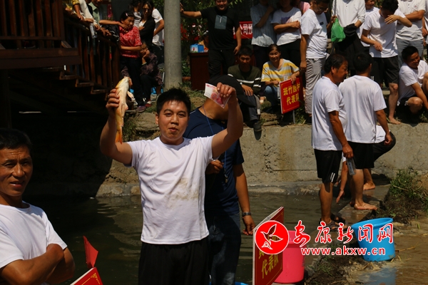“抓魚比賽開始……“隨著一陣陣吆喝聲,不遠處的稻田里,圍觀者把稻田圍得密不透風。哨子聲一響,只見各村參賽選手們脫鞋挽袖赤腳,沖進泥水中彎腰低頭摸魚開始摸魚,圍觀的村民們不約而同地息聲屏氣。“抓住了!”忽地探入水中的手停住了,選手吆喝了一聲,逮到魚兒的選手激動不已,高高舉起鮮活扭動的魚兒。頓時稻田上空一陣歡呼,大家歡聲笑語打成一片……選手們徒手捉魚,高高舉起 “戰(zhàn)利品”放聲歡呼,享受捕獲魚兒帶來的喜悅,滿臉泥漬也掩蓋不住內(nèi)心的歡喜。